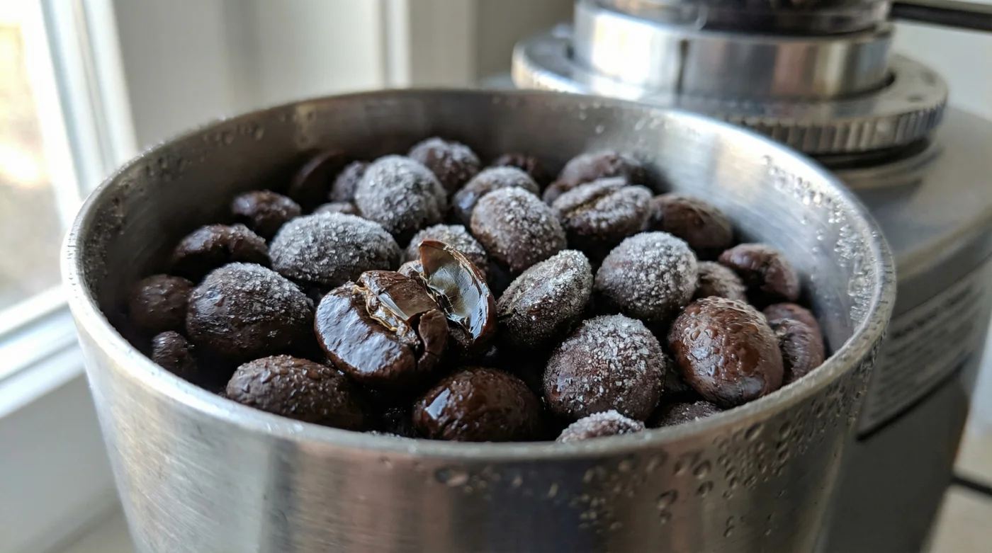 Häll de frostiga bönorna i kvarnen. Lyssna. Du kommer att märka skillnaden direkt. Det plågade, hackande ljudet är borta. Istället hör du ett krispigt, jämnt och tillfredsställande knaster. Kvarnen arbetar lättare, och pulvret som faller ner i din behållare liknar mjuk sand snarare än en blandning av grus och florsocker.