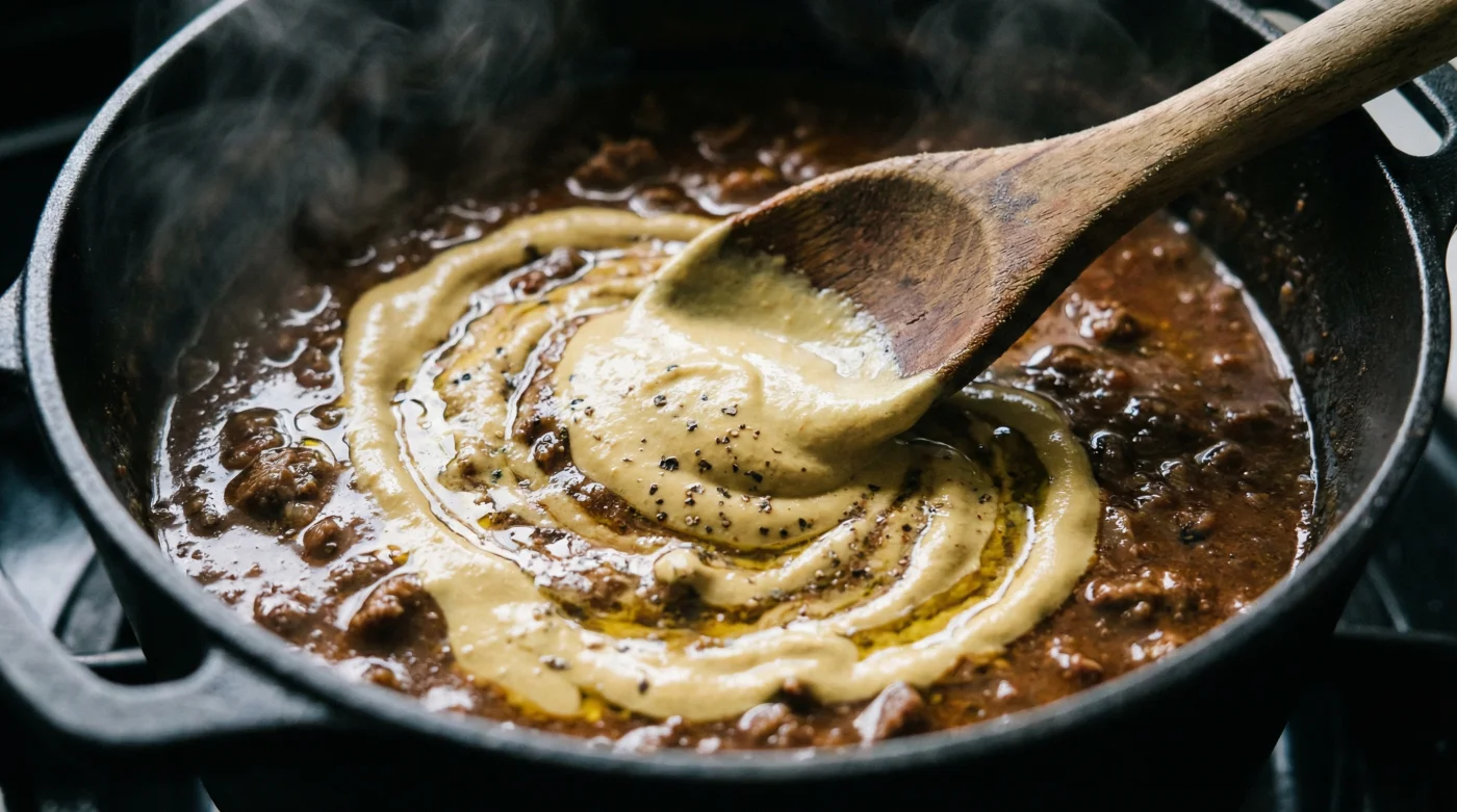 Vatten och fett är, som du vet, bittra fiender. De stöter bort varandra oavsett hur mycket och hur kraftigt du rör om med träsleven. För att få dem att hålla varandra i handen behöver du ett emulgeringsmedel. Dijonsenap innehåller naturliga slemämnen (så kallade mucilage) i senapsfröets skal, samt specifika proteiner. När du introducerar dessa i din gryta, lägger de sig som en mikroskopisk skyddsbarriär runt varje enskild fettdroppe. De tvingar fettdropparna att stanna kvar i vätskan, utspridda, istället för att klumpa ihop sig och flyta upp till ytan.