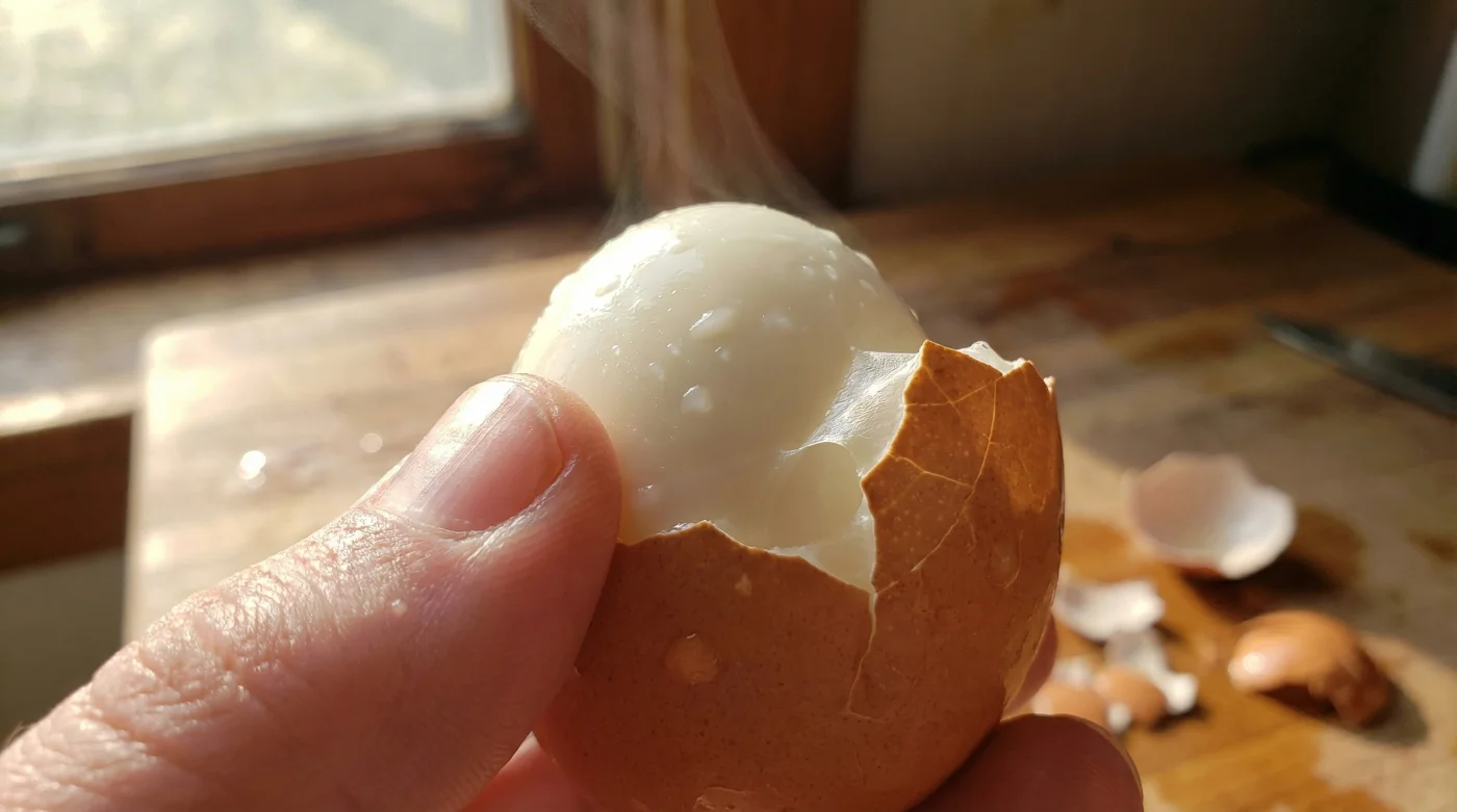 Han förklarade tålmodigt att bikarbonat dirigerar om hela samtalet mellan ägget och det kokande vattnet. När du tillsätter bikarbonat skapar du en svagt alkalisk miljö. Detta basiska vatten tränger in genom det porösa äggskalet och neutraliserar omedelbart den sura miljön innanför. Det tvingar proteinerna i den envisa hinnan att slappna av och släppa sitt hårda grepp om den ömtåliga vitan. Du lurar helt enkelt det färska ägget att tro att det har legat i kylskåpet i flera veckor.