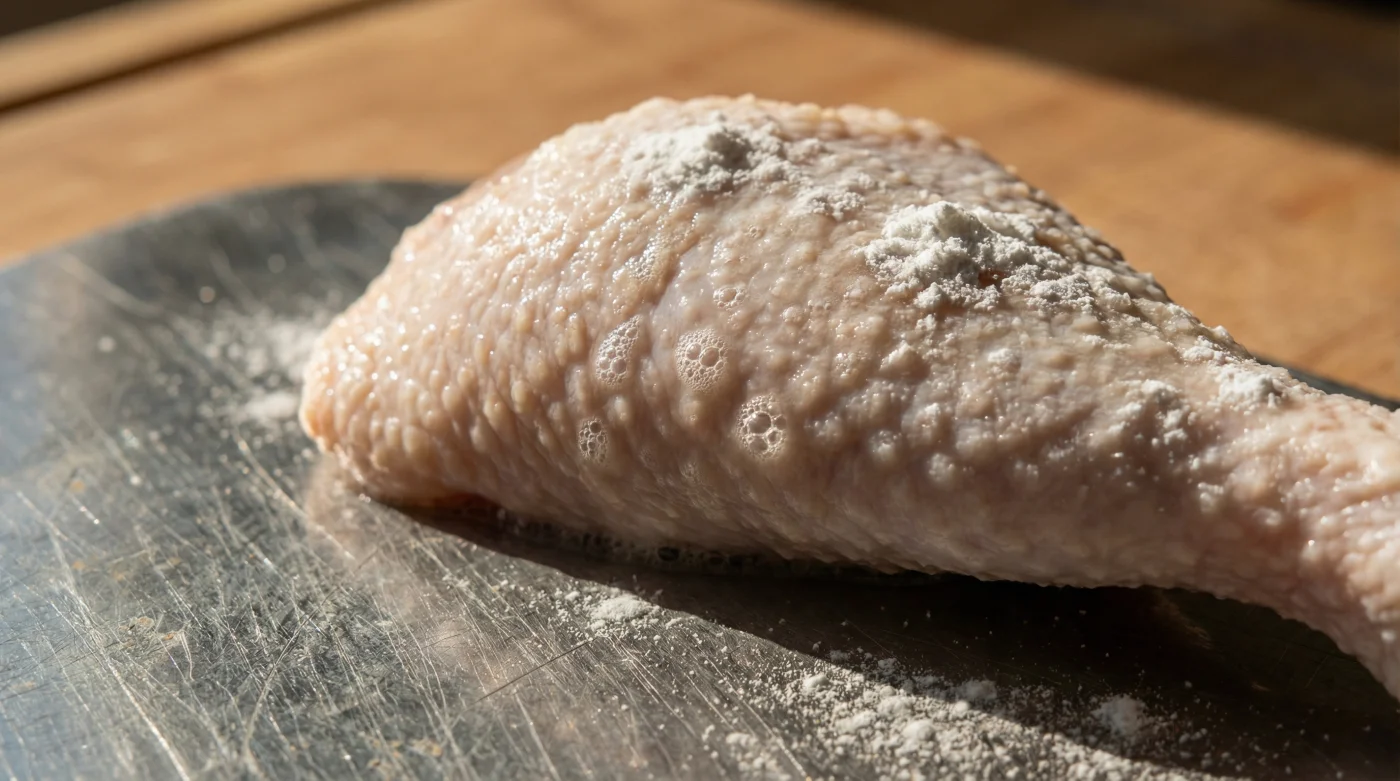 När du masserar in bakpulver på kycklingskinnet händer något fascinerande omedelbart på mikronivå. Bakpulvret är lätt alkaliskt, vilket betyder att det höjer pH-värdet i skinnet. När pH-värdet stiger slappnar proteinerna av. De envisa peptidbindningarna, som annars håller kvar fukten och gör skinnet segt, börjar brytas ner snabbare.