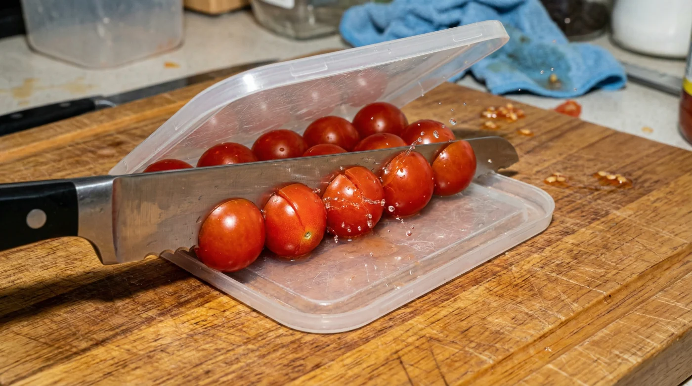 Genom att samla dem mellan två platta, vanliga plastlock från gamla matlådor eller förvaringsburkar tvingar du in råvarorna i ett tillfälligt, skyddat utrymme. Locken agerar golv och tak. Den mjuka kompressionen håller fast varje enskild tomat utan att krossa innanmätet, vilket omedelbart förvandlar ett tredimensionellt problem till en hanterbar, tvådimensionell skiva redo att delas.