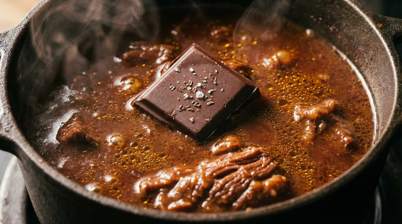 Det handlar om en specifik, nästan aggressivt mörk råvara. Genom att bryta av ett par rutor mörk choklad och låta dem smälta ner i din puttrande köttgryta förändras hela kemin i kastrullen på bara några minuter. Det rostade kakaosmöret bygger omedelbart en bro över syran i rödvinssåsen och köttets skarpa sälta. Kakaons komplexitet omfamnar ingredienserna och tvingar fram en nästan overkligt djup umamismak som fyller ut alla tomrum i gommen.