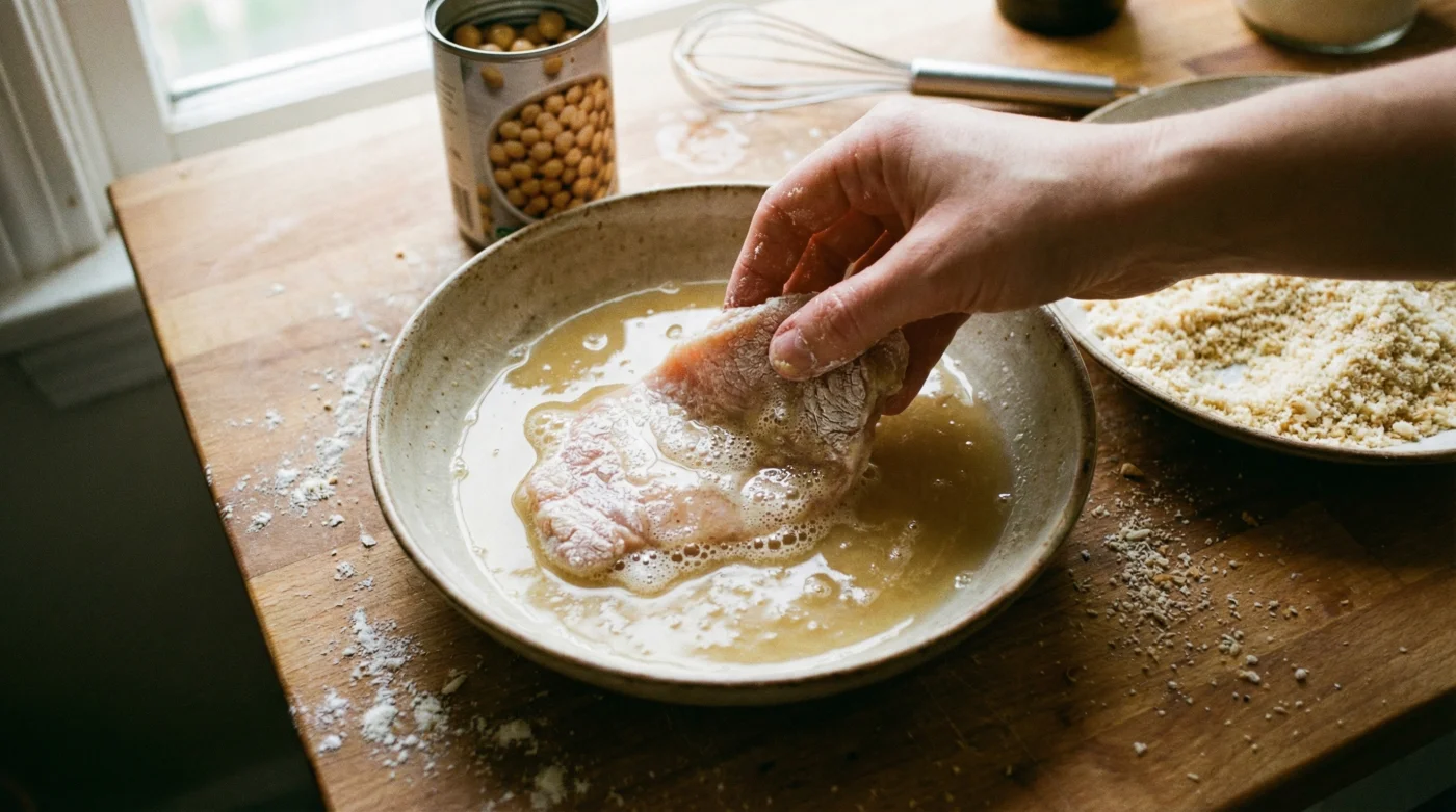 Den mekaniska logiken bakom detta byte är slående. Ägg kan ibland vara för tjocka och trådiga, vilket skapar klumpar av mjöl och ströbröd. Kikärtsspadets viskositet är slätare. Det eliminerar små luftfickor och döda vinklar där fukten annars tränger in och gör ytan mjuk under stekningen.