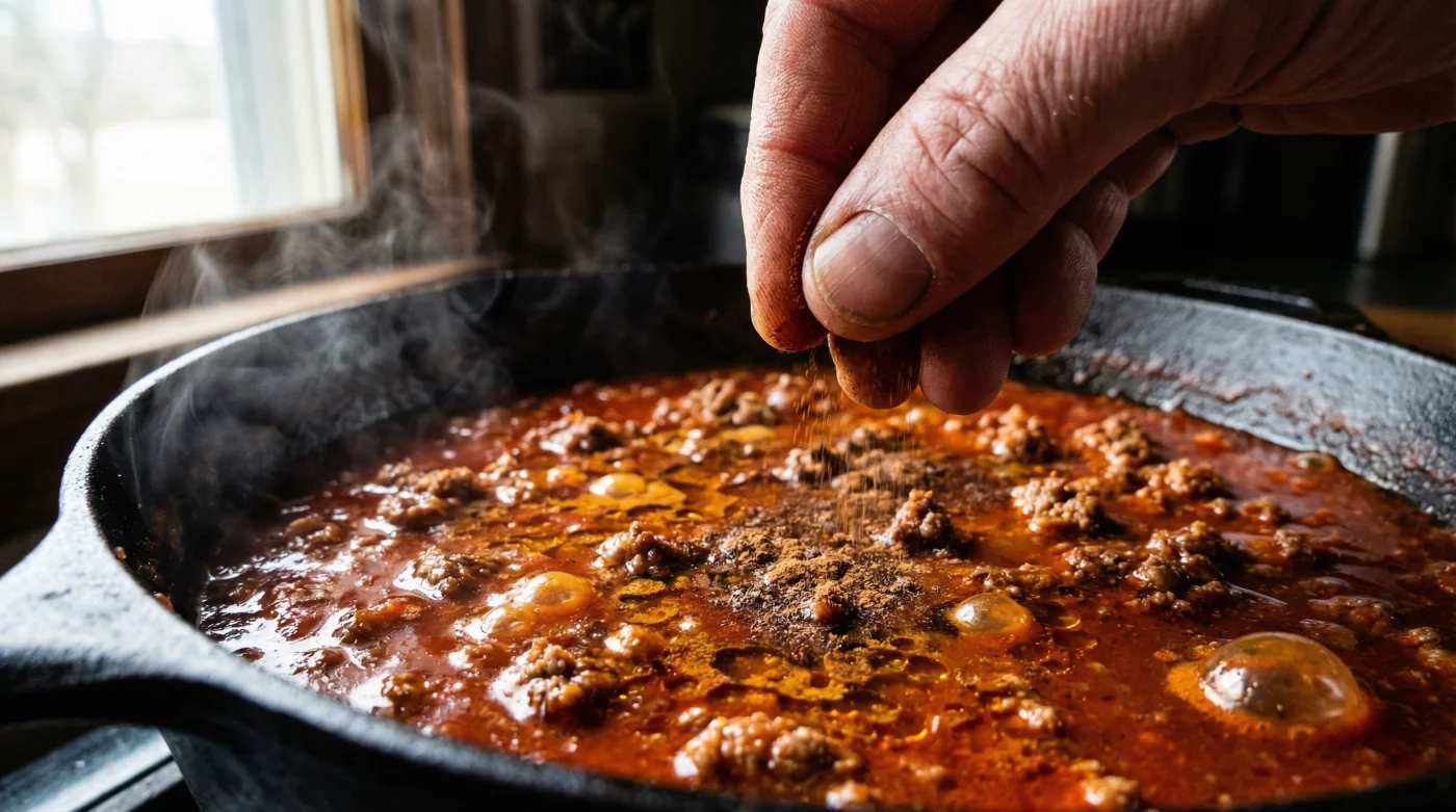 Att applicera denna teknik kräver din totala närvaro. Du kan inte bara kasta ner en sked kanel på slutet, precis innan servering, och hoppas på det bästa. Det kräver en fysisk, medveten handling i exakt rätt ögonblick. När du har brynt din köttfärs så att den fått ordentligt med färg, sänker du värmen något i pannan.