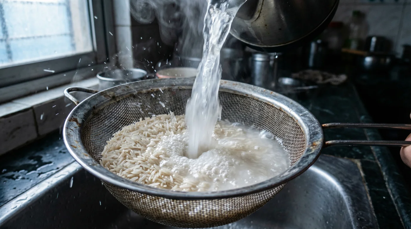Håll silen i ena handen över den tomma vasken. Häll sedan det kokande vattnet jämnt över riset i en långsam, svepande och cirkulerande rörelse. Låt vattnet strömma över kornen under ungefär tjugo till trettio sekunder, beroende på mängden ris. Du kommer att se med egna ögon hur den där täta, vita stärkelsen omedelbart ger upp, släpper sitt grepp om kornet och sköljs bort. Det är en otroligt tillfredsställande syn som nästan känns som ett trolleritrick.