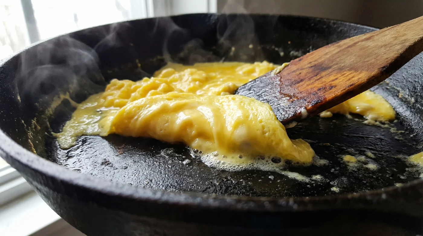 Men på bara några sekunder händer det som nästan alltid händer. Den gyllene, mjuka massan stelnar snabbt, drar ihop sig och förvandlas till något som obehagligt mycket påminner om fuktiga tvättsvampar. Besvikelsen är omedelbar. Att tugga på en äggröra som studsar lätt mot tänderna kräver mer envishet än njutning för att kunna sväljas.