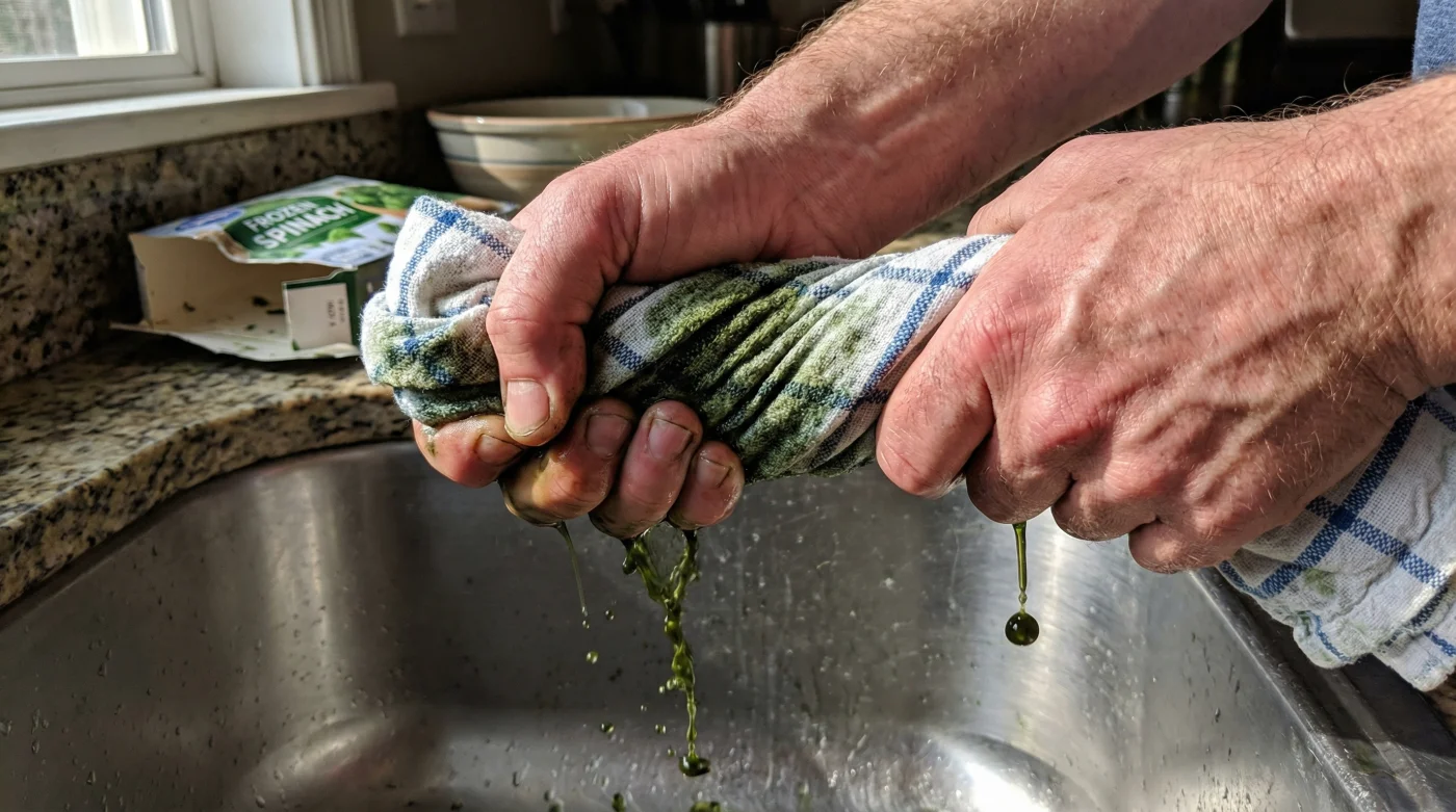 Hur gör man då detta på rätt sätt? Det är lätt att tro att man kan fuska genom att pressa lite lätt med baksidan av en slev mot ett nät. Men det räcker inte. Det kräver en medveten, fysisk insats. Börja alltid med att tina din frysta spenat helt och hållet. Om det finns den minsta lilla isiga kärna kvar i mitten kommer den fukten att förbli bunden, bara för att förrädiskt sippra ut när rätten väl når tvåhundra grader i ugnen.