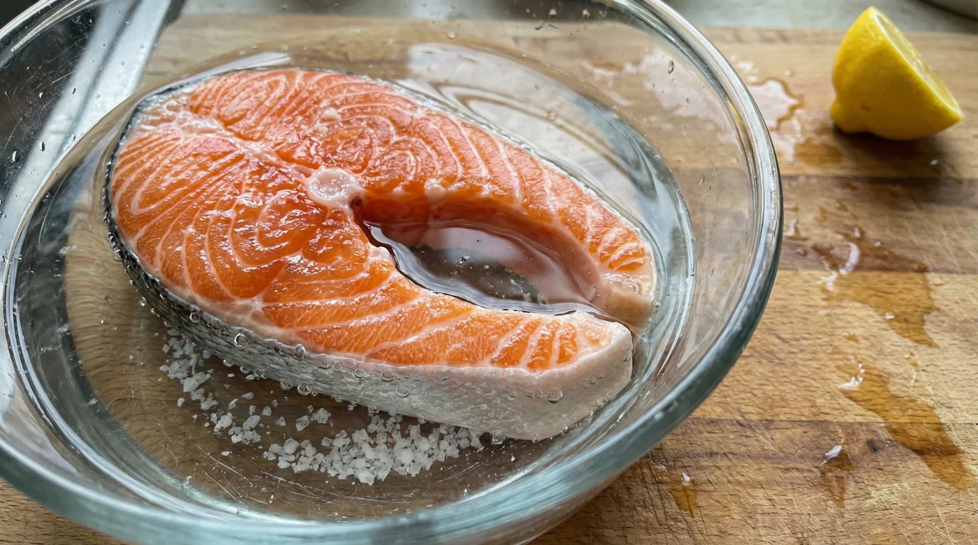 Att applicera detta i ditt eget kök kräver absolut ingen extra utrustning, bara en gnutta framförhållning. Häll upp en liter kallt vatten i en stor, vid bunke. Rör ner ungefär fyra matskedar vanligt salt tills kristallerna har lösts upp helt i vattnet. Det ska smaka ungefär som en rejäl kallsup i Kattegatt. Sänk sedan mycket försiktigt ner dina portionsbitar av färsk lax i det iskalla vattnet.
