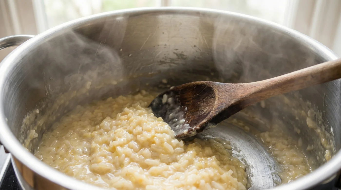| Uppkoket på spisen | 100°C (direkt undervärme) | Stärkelsen i rundkornigt ris sprängs öppen och börjar snabbt absorbera vätskan. |