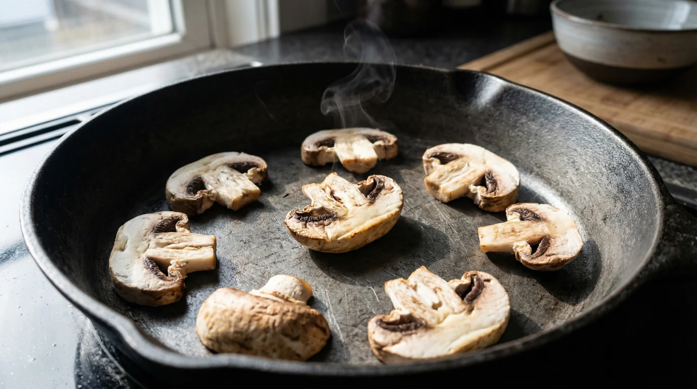 Att steka svamp handlar mycket om fysisk närvaro och förståelse för vad råvaran kräver just nu. Börja med att skära dina champinjoner i jämna, ganska tjocka skivor. Värm upp en gjutjärnspanna eller kolstålpanna till medelhög värme. Den ska vara helt ren och absolut torr. Det betyder inget smör, ingen olivolja, ingen rapsolja.